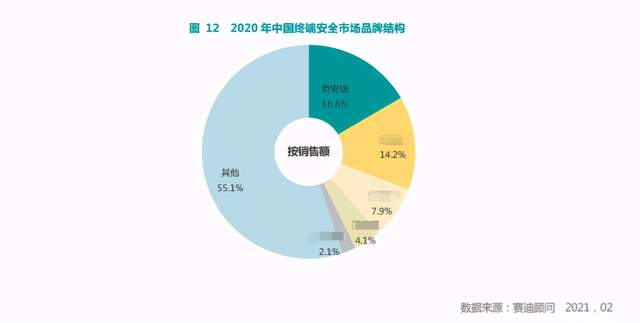《报告》数据显示,在终端安全市场领域,2020年,终端安全产品(包括终端安全管理、终端防病毒、终端流量监测等)的需求仍然在不断上升,2020年的市场规模达到36.6亿元,增长率为15.6%。奇安信集团在此领域以16.6%的市场份额排名第一。