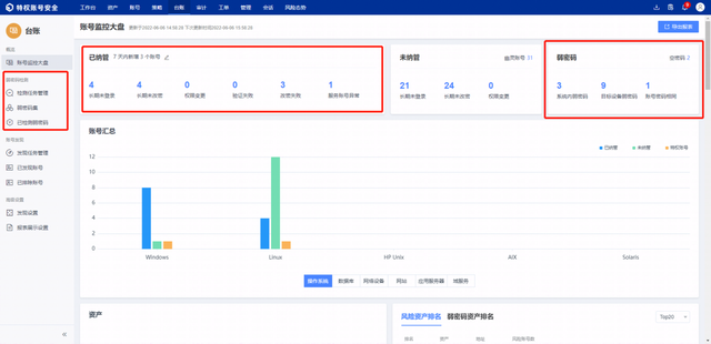 同时,因涉及到攻击者的最终利益,特权账号往往是攻击者瞄准的重点攻击目标。特权账号由于其分布广、数量多的特点造成特权账号梳理难,组织管理员无法全面的掌握特权账号动态情况。加上僵尸账号、幽灵账号、后门账号、弱口令账号、长期未改密账号等风险账号等广泛存在,且比较隐蔽,给系统资产带来很大的安全隐患。