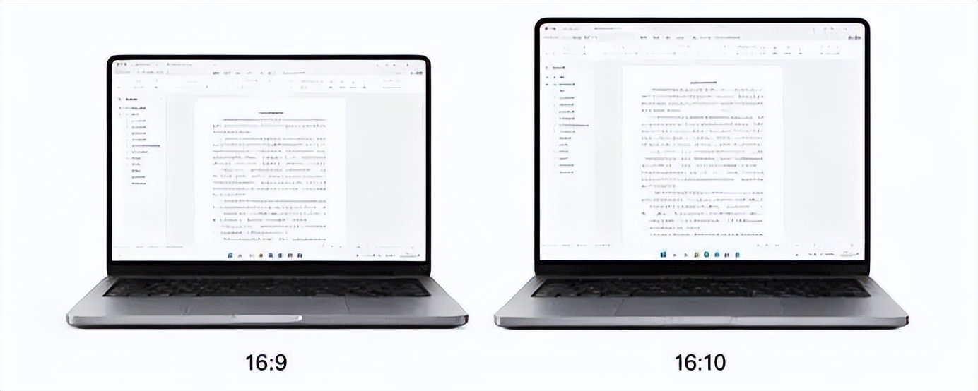 在同宽场景下,16:10的笔记本电脑屏幕比16:9面积约大11.1%,可显示的内容也就更多。以文本处理为例,相当于从27行扩展至30行,多了3行左右文本内容。