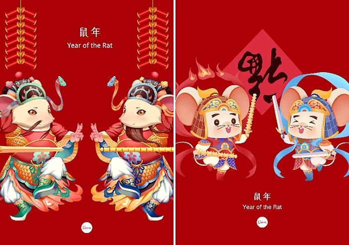 在近千个设计模板中,2020年中国“门神”海报,获得了广泛关注。Canva中国调整了传统上“聪明机灵”的鼠元素,加入了新的设计理念,让农历庚子鼠年的门神贴画既经典又时尚。
